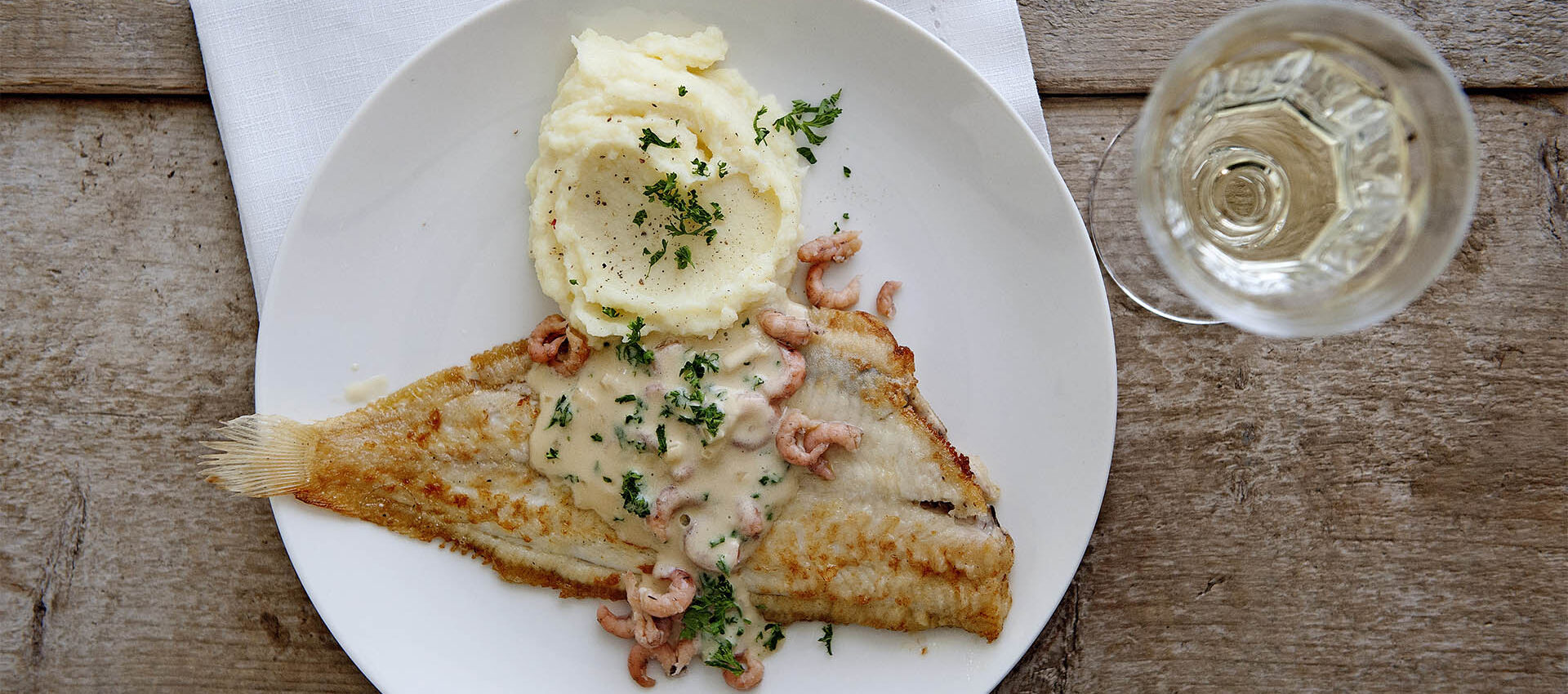 Gebakken sliptong met garnaaltjes en witte wijnsaus