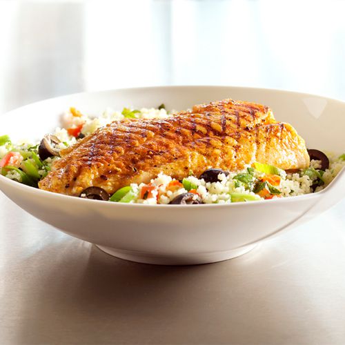 Rooster de visfilets in een hete grillpan mooi bruin en net aan gaar, ca. 3 minuten per kant. Meng intussen de rest van het citroensap met 3-4 eetlepels olijfolie en schep deze dressing met de bosuitjes, munt, peterselie, tomaten en olijven door de couscous. Serveer de couscous met de roodbaarsfilets erop.