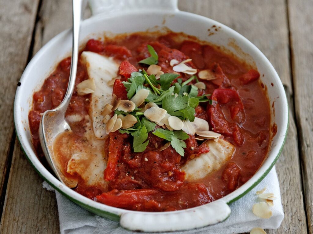 Gestoofde tarbotfilet met tomaten-paprikasaus