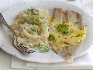 Gestoofde sliptong met saffraansaus en romige venkelrisotto