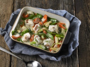 Foto van kabeljauwschotel met frisse voorjaars groenten