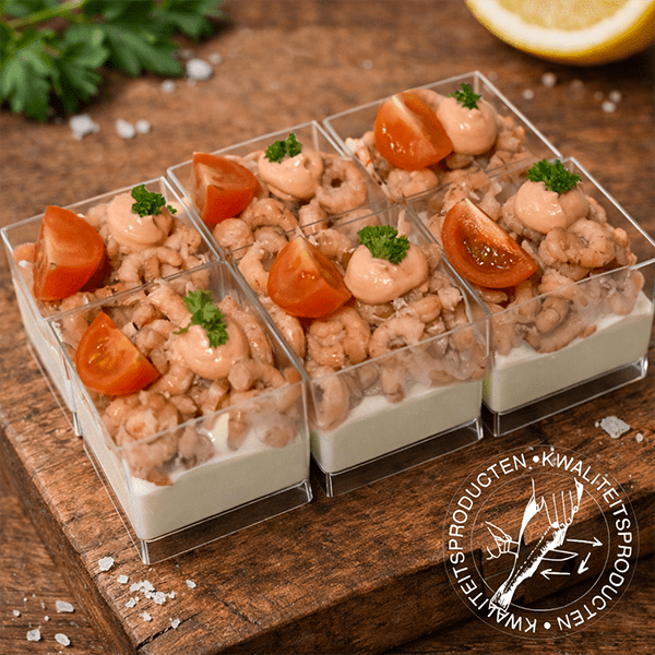 Luxe amuseset met Hollandse garnalen, te koop per 6 stuks. Een verfijnde combinatie van Hollandse garnalen, romige cocktailsaus en zachte avocado. Perfect om gasten te verrassen bij een diner of borrel.