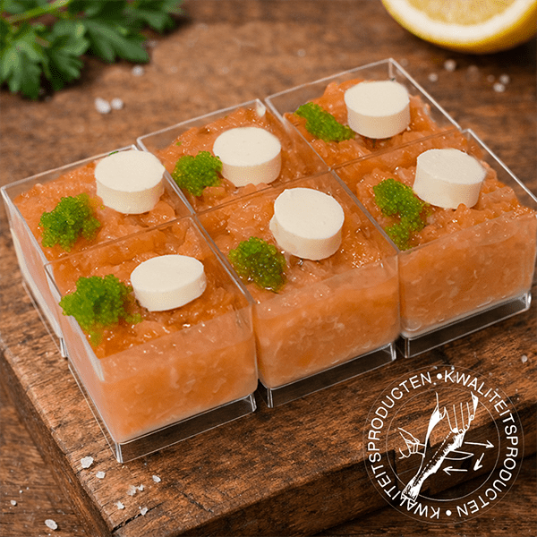 Luxe amuseset met zalm. Een verfijnde combinatie van zalm, tomaat en tijm. Perfect om gasten te verrassen bij een diner of borrel.