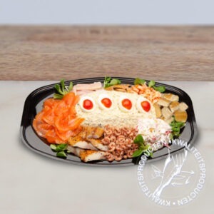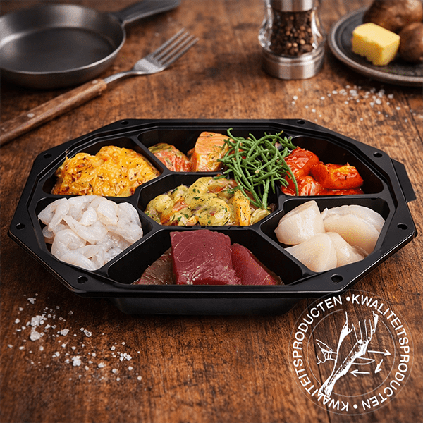 Ingrediënten: tonijn (Geelvin/Thunnus albacares; vangst Indonesië, FAO 57 & 71) l zalm (Salmo salar; gekweekt in Noorwegen) l gamba’s (Litopenaeus vannamei; gekweekt in India, water, zout, E451) l heilbot (Hippoglossus hippoglossus; vangst FAO27); Coquilles, water, zout, zuurteregelaar.