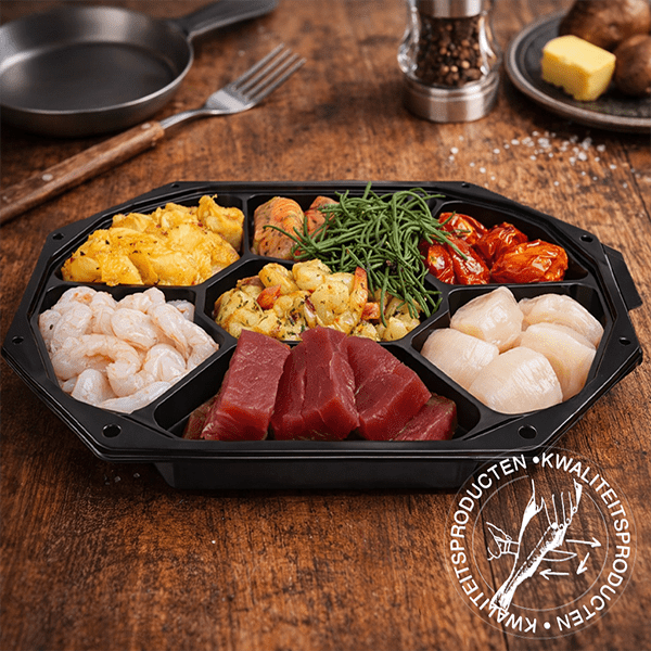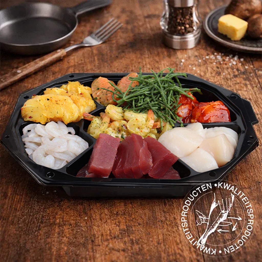 Ingrediënten: tonijn (Geelvin/Thunnus albacares; vangst Indonesië, FAO 57 & 71) l zalm (Salmo salar; gekweekt in Noorwegen) l gamba’s (Litopenaeus vannamei; gekweekt in India, water, zout, E451) l kabeljauw (Gadus morhua; vangst FAO 27) l heilbot (Hippoglossus hippoglossus; vangst FAO27) l zeeduivel (Lophius piscatorius; vangst FAO27) l Coquilles, water, zout, zuurteregelaar.