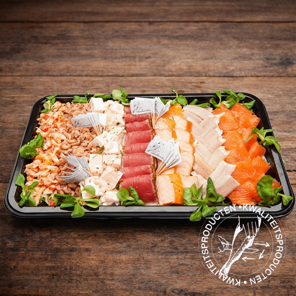 Ingrediënten: gestoomde zalm (Salmo salar; gekweekt in Noorwegen), zout, rook l gerookte paling (Anguilla anguilla; gekweekt in Nederland), zout, rook l gerookte zalm (Salmo salar; gekweekt in Noorwegen), zout, rook l tonijnrosbief (97% tonijn (Thunus albacares, Geelvin; vangst FAO71) | koriander l kaneel l kardemom l piment l mosterdmeel l anijs l laurierblad l zout l paprika l peper l gember l selderijzaad l foelie l kurkuma l komijn l rijstebloem l ui l natuurlijk aroma l majoraan l sesamzaad l zonnebloemolie l olijfolie) l Hollandse garnalen (Crangon crangon; vangst Noordzee), zout, E330, E270, E210 l rivierkreeftenvlees (((Procambarus clarkii; vangst zoet water China), zout, E260, E270, E210) l noordzeepate (zalm (Salmo salar; gekweekt in Noorwegen) l kabeljauw (Gadus morhua; vangst FAO27) l gerookte zalm (Salmo salar; gekweekt in Noorwegen), zout, rook l gerookte paling (Anguilla anguilla; gekweekt in Nederland), zout, rook l Hollandse garnalen (Crangon crangon; vangst Noordzee), zout, E330, E270, E210 l rivierkreeft (((Procambarus clarkii; vangst zoet water China), zout, E260, E270, E210) l room, carrageen l gelatine (100% varkensgelatine) l bieslook l peper l zout) l veldsla