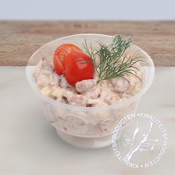 Ingrediënten: 25% Hollandse garnalen (Crangon crangon; vangst Noordzee), zout, E330, E270, E210 | mayonaise (mayonaise (plantaardige olie (soja), scharreleigeel, water, mosterd (water, mosterdzaad, azijn, zout, specerijen), azijn, suiker, zout, conserveermiddel (kaliumsorbaat), aroma, verdikkingsmiddel (xantaangom), antioxidant: (calciumdinatrium EDTA) | basissaus; water, plantaardige olie (raapzaad), gemodificeerd mais zetmeel, glucose-fructosestroop, scharreleigeel, gemodificeerd zetmeel, zout, voedingszuren (azijnzuur, citroenzuur), verdikkingsmiddel (guarpitmeel), conserveermiddel (kaliumsorbaat), zoetstof (sacharinen), calciumdinatrium-EDTA) | appel | bieslook | cognac