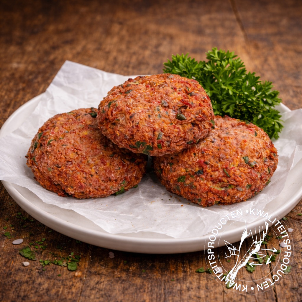 Huisgemaakte krokante krabburger van surimi, rode ui en peterselie. Heerlijk kruidig en smaakvol, perfect te combineren met wilde rijst en paksoi.
