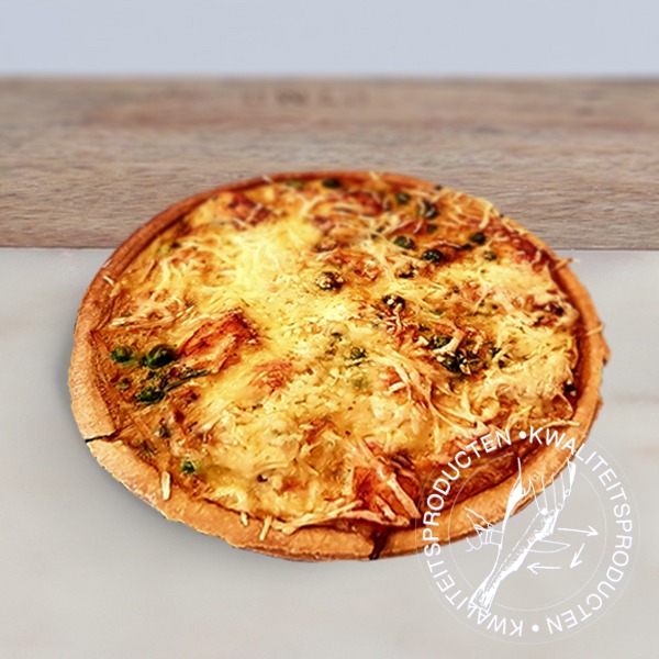 Quiche bodem (tarwebloem, margarine (palmvet, water, raapzaadolie, emulgatur: E471, voedingszuur: E330), water, zout), 30% zalm (Salmo salar; gekweekt in Noorwegen), rode ui, peterselie, room (room, carrageen), ei, geraspte kaas (gepasteuriseerde koemelk, gedroogd aardappelzetmeel, zout, zuursel, stremsel, conserveermiddel E251, kleurstof E160a/b), tuinerwten, kerrie masala (kruiden en specerijen, kurkuma, koriander, peper, fenegriek, mosterd, karwij, lavasblad, djienten, chillipoeder, selderie), 20% wortel (winterpeen), tuinerwten, zwarte peper.