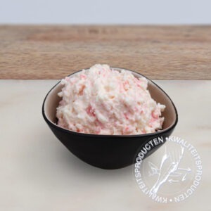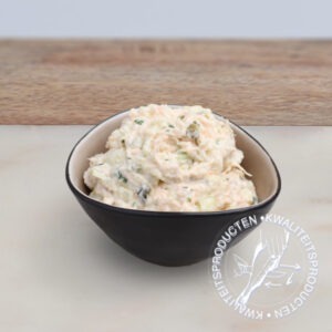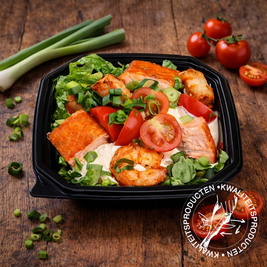 Huisgemaakte salade met gamba’s, stukjes zalm, romige rouille-mayonaise, sla, lente-ui en cherrytomaatjes. Fris, luxe en vol smaak.