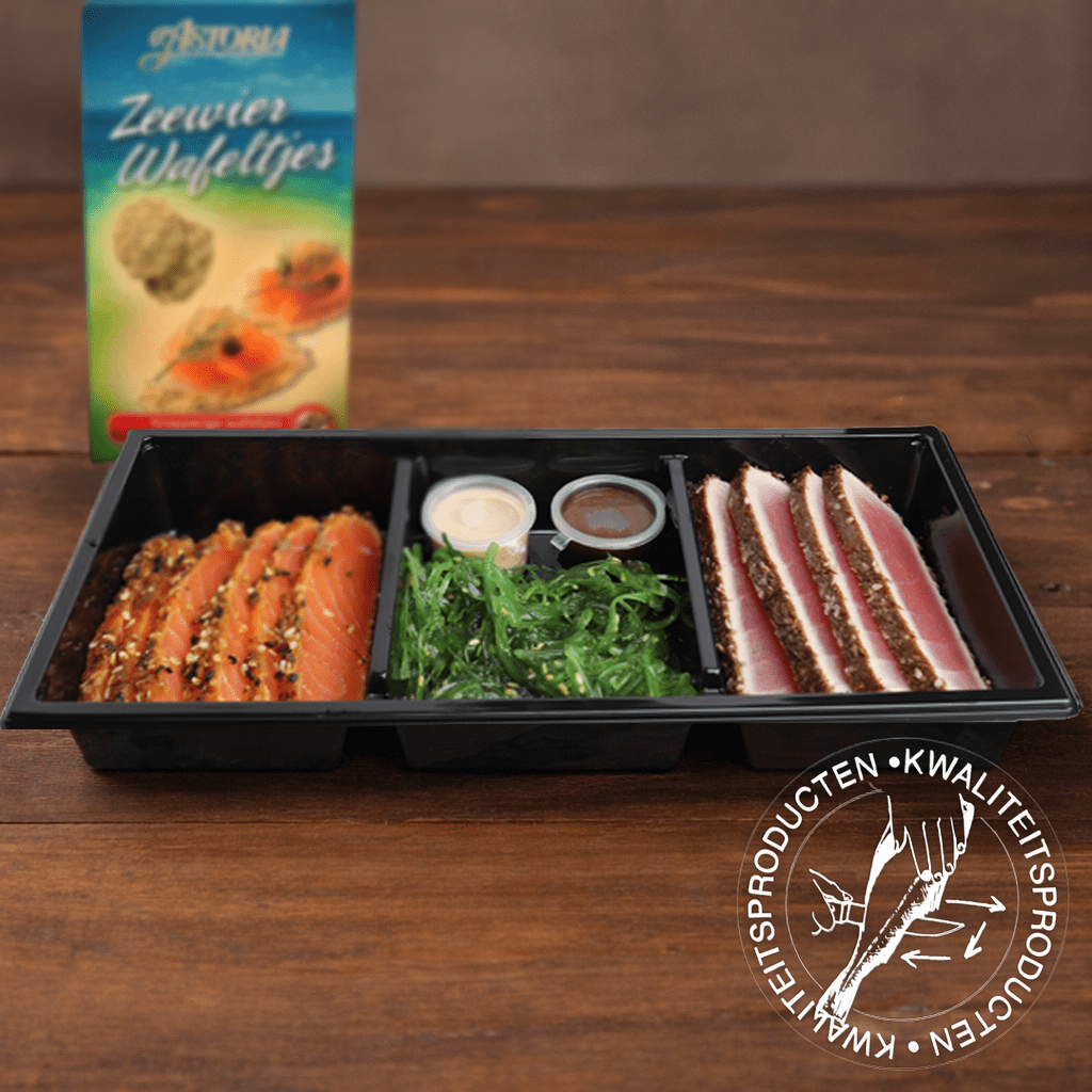 Tataki-set van aangebraden tonijnfilet en zalmfilet, lekker met wakame en dressing.
