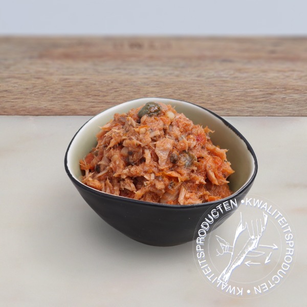 Ingrediënten: 50% tonijn (Skipjack; Katsuwonus pelamis, vangst Stille Oceaan), zonnebloemolie, zout) l zwarte olijven (onbehandelde zwarte olijven in pekel, zout (NaCl), plantaardige vetten 4.0%, E202, E200, E509) l gedroogde tomaat (tomaten, zout, kruiden, citroenzuur, koolzaadolie) l tomaat l kappertjes (kappertjes, zout, water, witte wijnazijn) l paprika (rode paprika, water, zout, suiker, azijn (6% azijnzuur), uienpoeder l knoflookpoeder