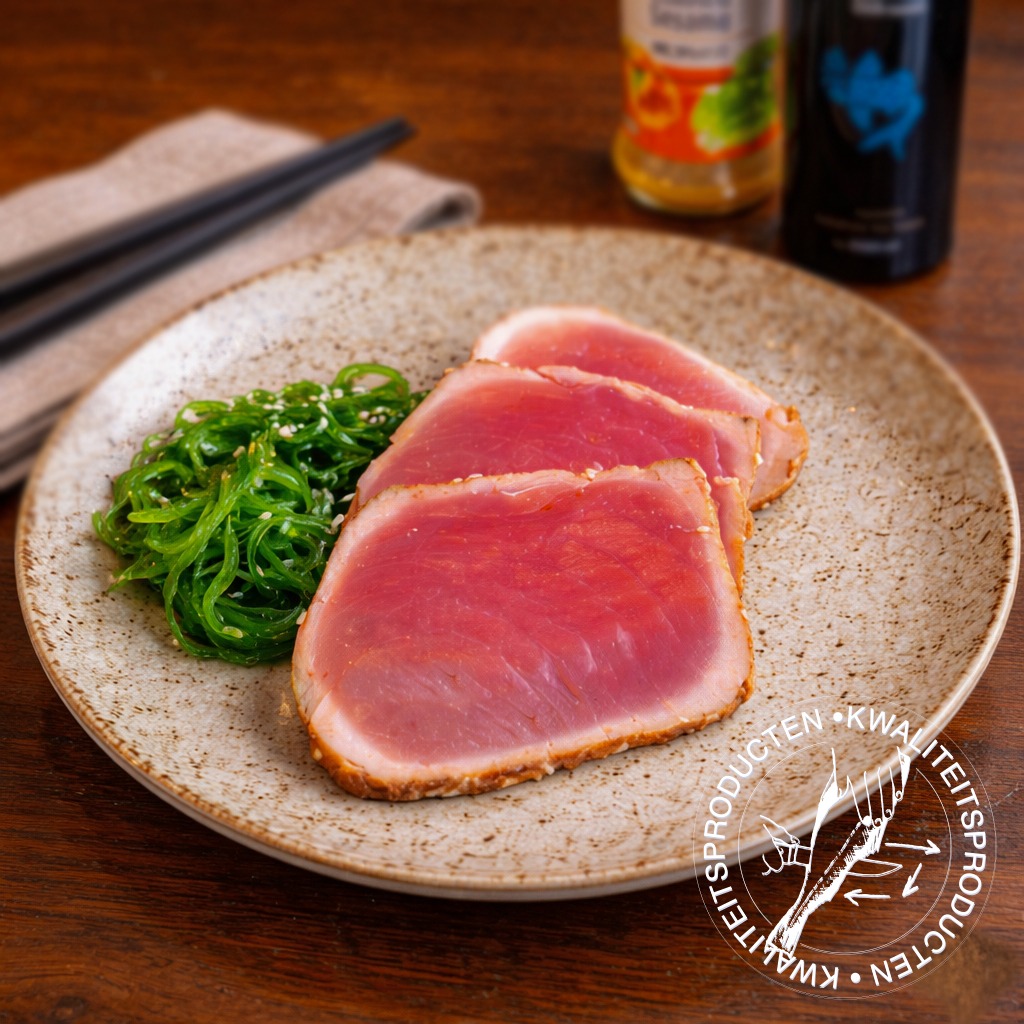 Heerlijke tonijnrosbief, mals en vol van smaak. Perfect als luxe beleg op een toastje of als voorgerecht met sesamdressing en wakame.