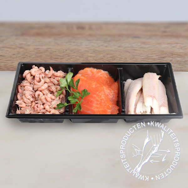 Luxe vistrio van gerookte paling, huisgerookte zalmfilet en Hollandse garnalen.