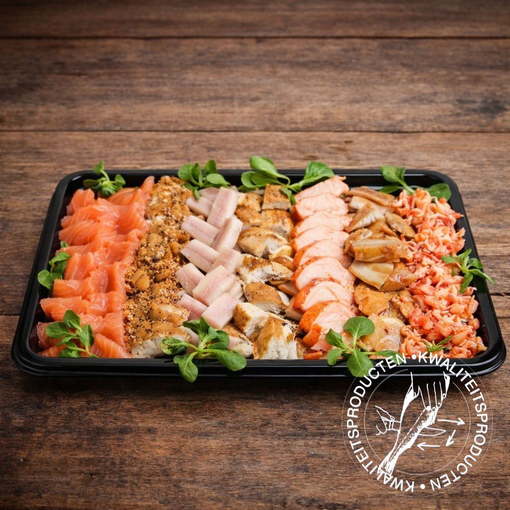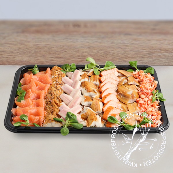 Ingrediënten: gestoomde zalm (Salmo salar; gekweekt in Noorwegen), zout, rook l gerookte paling (Anguilla anguilla; gekweekt in Nederland), zout, rook l gerookte zalm (Salmo salar; gekweekt in Noorwegen), zout, rook l rivierkreeftenvlees (((Procambarus clarkii; vangst zoet water China), zout, E260, E270, E210) l gerookte makreel (Scomber scombrus; vangst FAO27), zout, rook, peper l gerookte brado (haring (Clupea harengus; vangst FAO27), zout, rook) l veldsla