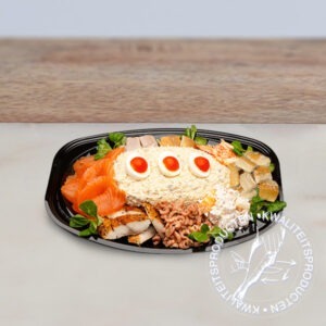 Ingrediënten: zalmsalade (30% zalm (Salmo salar; gekweekt in Noorwegen) | aardappel | mayonaise (mayonaise (plantaardige olie (soja), scharreleigeel, water, mosterd (water, mosterdzaad, azijn, zout, specerijen), azijn, suiker, zout, conserveermiddel (kaliumsorbaat), aroma, verdikkingsmiddel (xantaangom), antioxidant: (calciumdinatrium EDTA) | appel | augurk (azijn, zout, mosterdzaad, sacharine, aroma, riboflavine) | peterselie | peper | zout) l noordzeesalade (zalm (Salmo salar; gekweekt in Noorwegen) l kabeljauw (Gadus morhua; vangst FAO27) l mayonaise (plantaardige olie (soja), scharreleigeel, water, mosterd (water, mosterdzaad, azijn, zout, specerijen), azijn, suiker, zout, conserveermiddel (kaliumsorbaat), aroma, verdikkingsmiddel (xantaangom), antioxidant: (calciumdinatrium EDTA) l basissaus (water, plantaardige olie (raapzaad), gemodificeerd maiszetmeel, glucose-fructosestroop, scharrel-eigeel, gemodificeerd zetmeel, zout, voedingszuren (azijnzuur, citroenzuur), verdikkingsmiddel (guarpitmeel), conserveermiddel (kalium-sorbaat), zoetstof (sacharinen), calciumdinatrium EDTA) l Hollandse garnalen (Crangon crangon; vangst Noordzee), zout, E330, E270, E210) l rivierkreeft (((Procambarus clarkii; vangst zoet water China), zout, E260, E270, E210) l ananas (ananassap) l azijn l zout l water) l krabsalade grof surimi (55% crab chunk (surimi/witvis (Nemipterus spp, Saurida spp.) 39%, water, gemodificeerd tapioca zetmeel, sojaolie, tarwezetmeel, stabilisators: E170, E420, E450iii, E451i, E460ii, zout, suiker, krabextract, (bevat vis, schaaldieren, soja), glucosestroop, zuurteregelaars E260, E270, smaakversterkers: E621, E635, krabaroma, konjac meel, kleurstoffen: E120, E160c, E150c, kippenei poeder | (mayonaise (plantaardige olie (soja), scharreleigeel, water, mosterd (water, mosterdzaad, azijn, zout, specerijen), azijn, suiker, zout, conserveermiddel (kaliumsorbaat), aroma, verdikkingsmiddel (xantaangom), antioxidant: (calciumdinatrium EDTA) | basissaus (water, plantaardige olie (raapzaad), gemodificeerd maiszetmeel, glucose-fructosestroop, scharrel-eigeel, gemodificeerd zetmeel, zout, voedingszuren (azijnzuur, citroenzuur), verdikkingsmiddel (guarpitmeel), conserveermiddel (kalium-sorbaat), zoetstof (sacharinen), calciumdinatrium-EDTA) l ananas (water, suiker, E330) | perzik (water, suiker, E330) | peterselie) l gestoomde zalm (Salmo salar; gekweekt in Noorwegen), zout, rook l gerookte paling (Anguilla anguilla; gekweekt in Nederland), zout, rook l gerookte zalm (Salmo salar; gekweekt in Noorwegen), zout, rook l tonijnrosbief (97% tonijn (Thunus albacares, Geelvin; vangst FAO71) | koriander l kaneel l kardemom l piment l mosterdmeel l anijs l laurierblad l zout l paprika l peper l gember l selderijzaad l foelie l kurkuma l komijn l rijstebloem l ui l natuurlijk aroma l majoraan l sesamzaad l zonnebloemolie l olijfolie) l Hollandse garnalen (Crangon crangon; vangst Noordzee), zout, E330, E270, E210 l rivierkreeftenvlees (((Procambarus clarkii; vangst zoet water China), zout, E260, E270, E210) l gestoomde zalm (Salmo salar; gekweekt in Noorwegen), viskruiden ((zout, suiker, mosterdpoeder, dille, peterselie, witte peper, uienpoeder, selderij)l gerookte haaienbuik/ schillerlocken (Squalus suckleyi; vangst FAO 27), zout rook l ei (eieren, opgiet (water, zout, E330, E451, E211)) l tomaat l veldsla