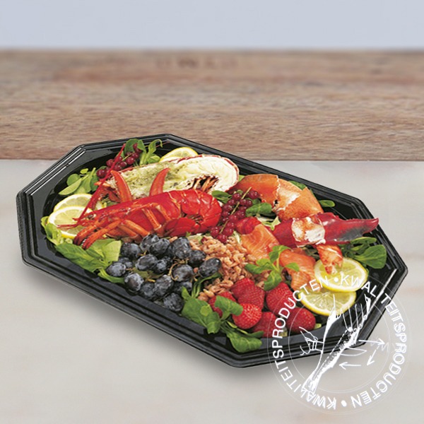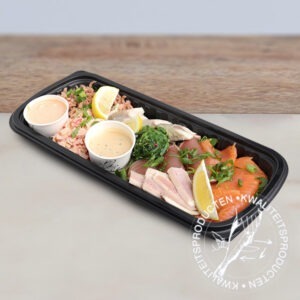 Ingrediënten: Canadese kreeft (Homarus Americanus; vangst Amerika/ Canada) l Hollandse garnalen (Crangon crangon; vangst Noordzee), zout, E330, E270, E210) l gerookte zalm (Salmo salar; gekweekt in Noorwegen), zout, rook l druiven l aardbei l citroen l aalbes l veldsla