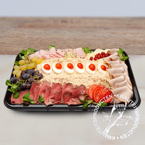 Ingrediënten: rundvleessalade grof (aardappel, water, raapzaadolie, 11,5% rundvlees, augurk, ui, gemodificeerd maïszetmeel, voedingszuren: azijnzuur, melkzuur, citroenzuur, scharrelkippeneigeel, zout, suiker, aroma (bevat melk), tarwezetmeel, smaakversterkers: E621, E631, maltodextrine, kruiden en specerijen (bevat mosterd), glucose, gistextract (bevat gluten), palmvet, conserveermiddelen: E202, E211, E250, E252, gehydrolyseerd tarwe en soja eiwit, dextrose, kleurstof: paprika extract, stabilisator: xanthaangom, zoetstof: sorbitol, antioxidant: E306) l boerenham (varkensvlees (95%), zout, glucosestroop, emulgator (E450, E451), conserveermiddel (E252, E250), antioxidant(E301), lactose, aroma, smaakversterker(E621) l rosbief (mager rundvlees 98%, voedingszuren E262 E326, glucosestroop, stabilisatoren E450 E451 E466, zout, antioxidanten E301 E331) l fricandeau (varkensplattebil z/zw, gezouten, gekruid) l augurk (azijn, zout, mosterdzaad, sacharine, aroma, riboflavine) l druiven l ei (eieren (opgiet (water, zout, E330, E451, E211)) l tomaat l veldsla