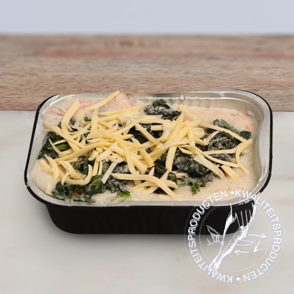 Zalmlasagne uit eigen keuken, in ovenschaaltje.