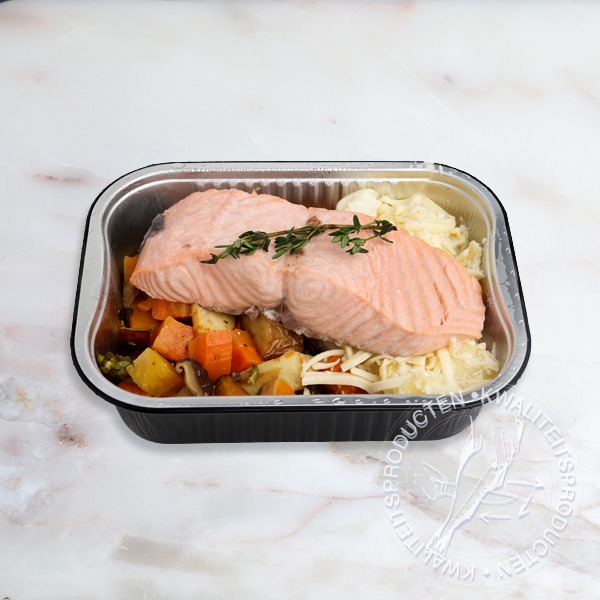 Zalmmaaltijd met groenten uit eigen keuken, in ovenschaaltje.