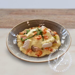 Zalm, geroosterde groenten, romige aardappelpuree, miso beurre Blanc saus