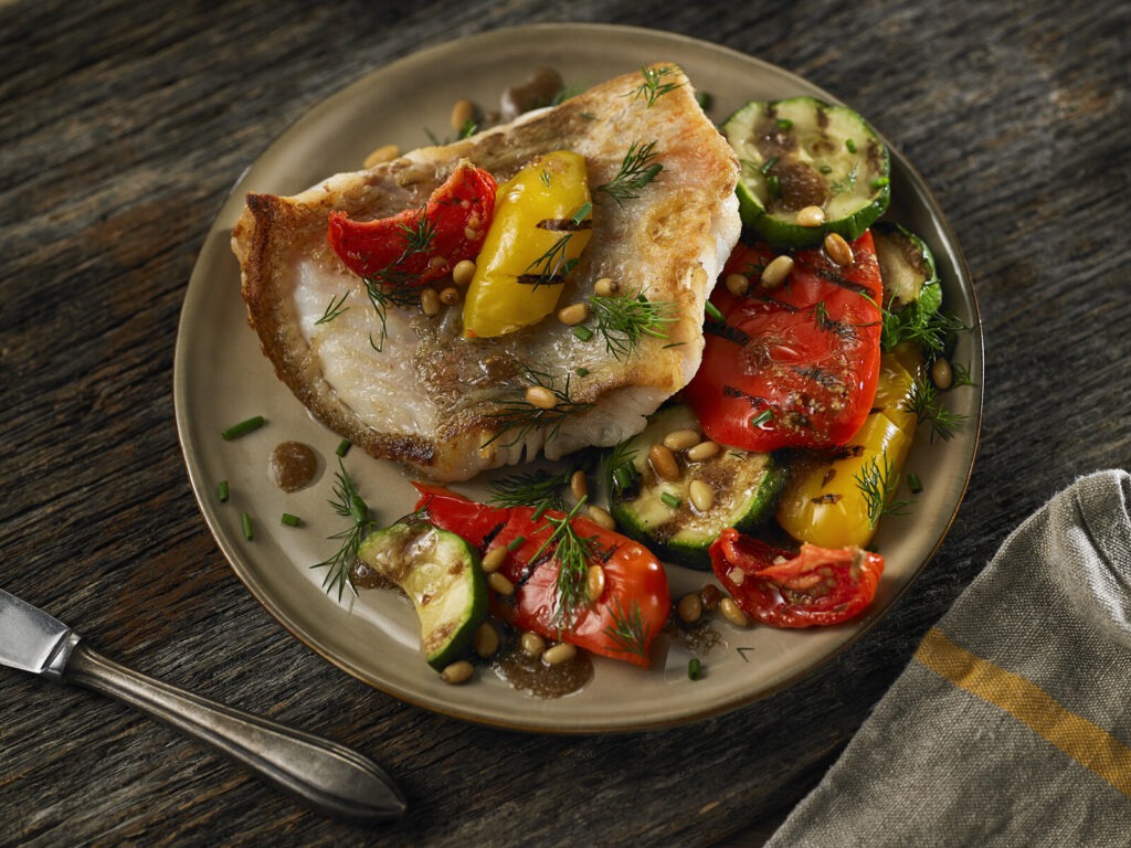 Roodbaars met gegrilde groenten en pijnboompitjes