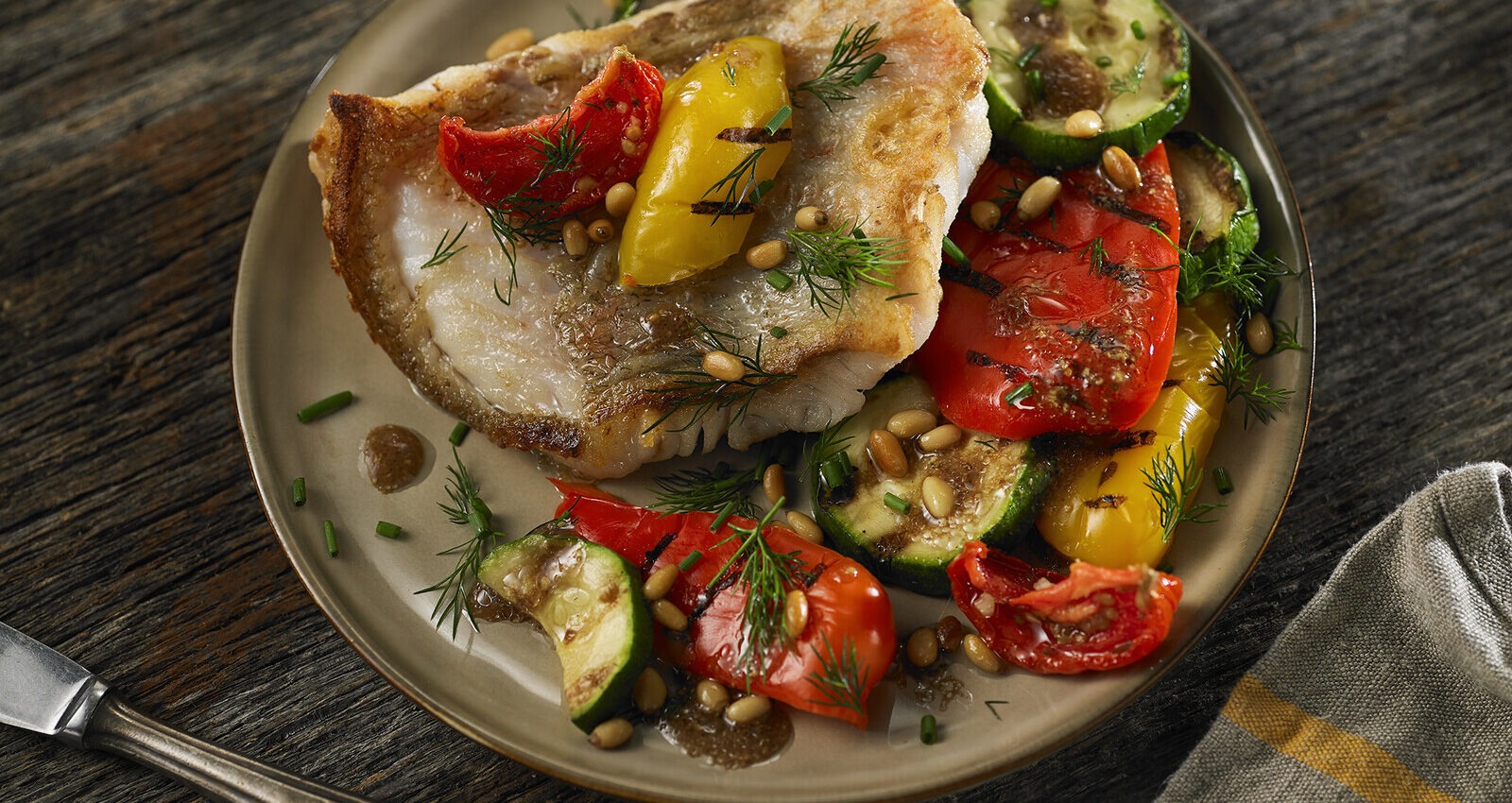 Roodbaars met gegrilde groenten en pijnboompitjes