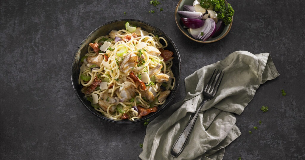 Schelvis spaghetti carbonara met bleekselderij