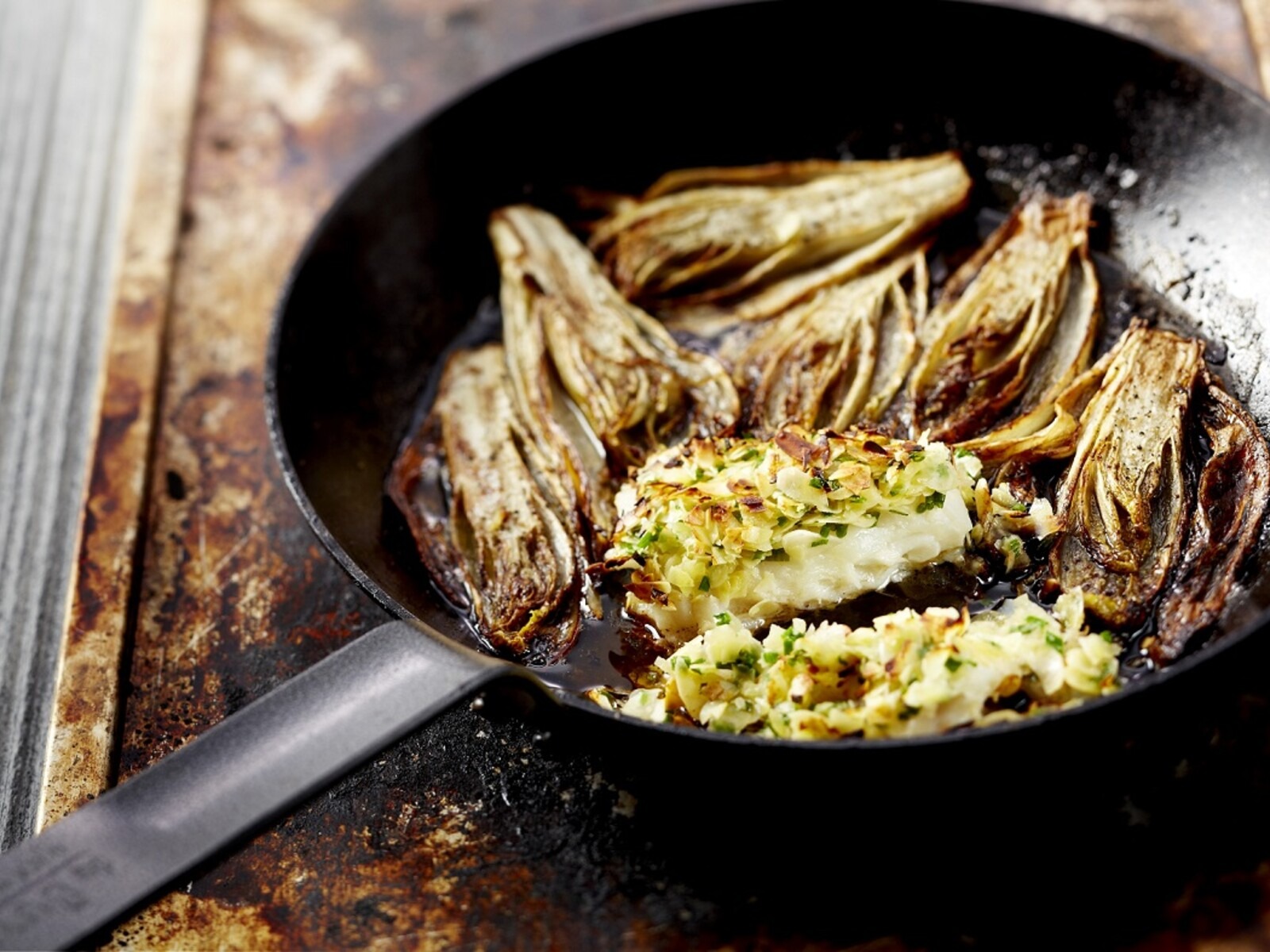 Zacht gegaarde schelvis met amandelen